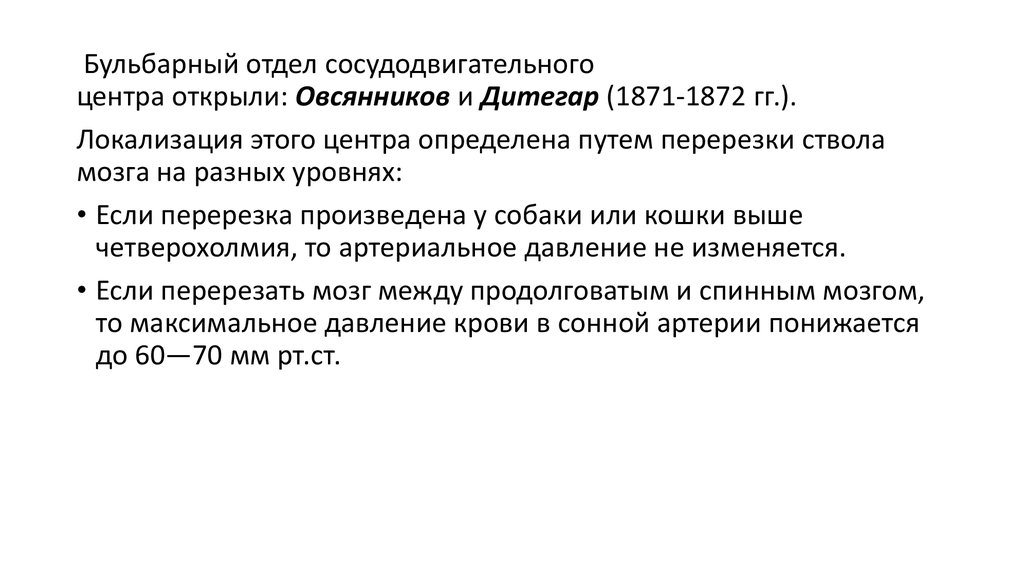 Бульбарный отдел сосудодвигательногоцентра открыли: Овсянников и Дитегар (1871-1872 гг.).