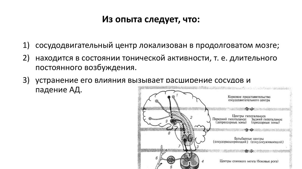 Уменьшается частота и незначительно сила сердечных сокращений16. Сосудодвигательный центр находится под контролем вышележащих нервных центров: