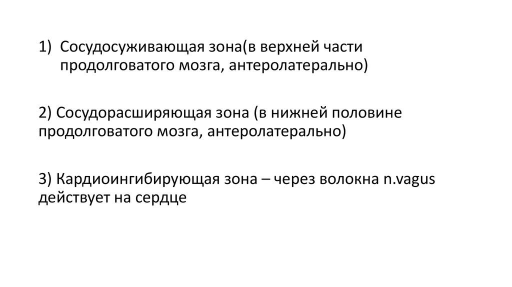 1) Сосудосуживающая зона(в верхней частипродолговатого мозга, антеролатерально)