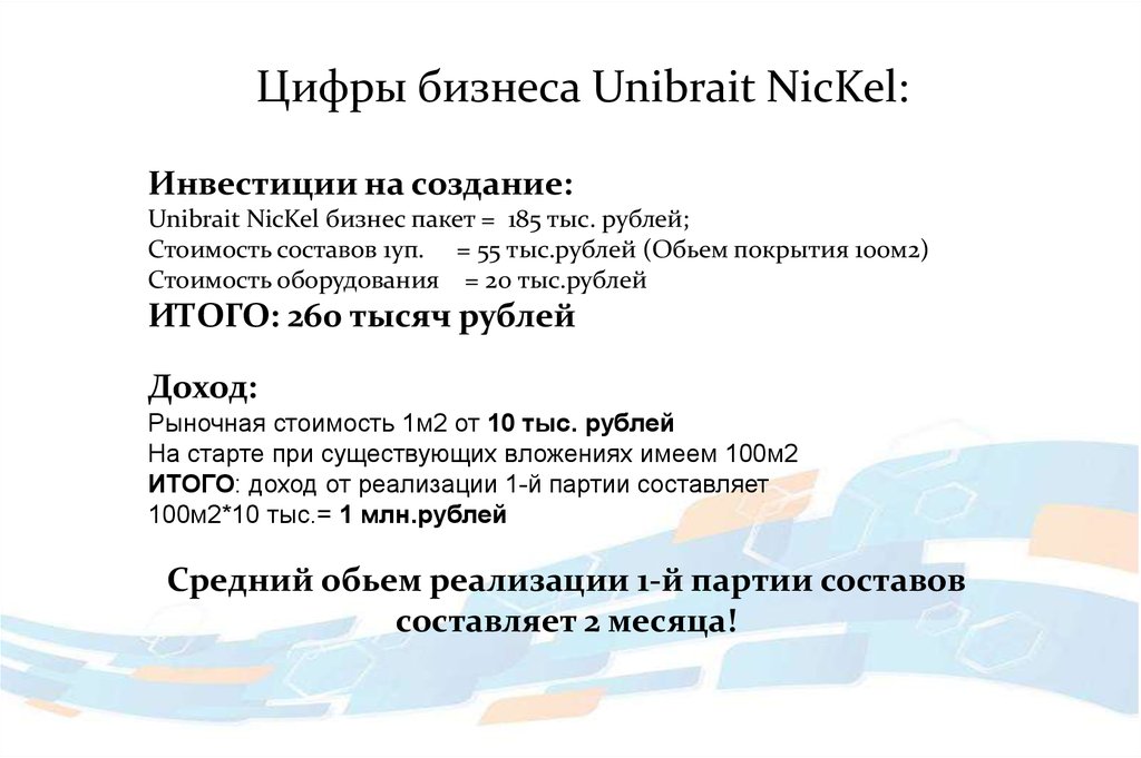 Цифры бизнеса Unibrait NicKel:Инвестиции на создание: