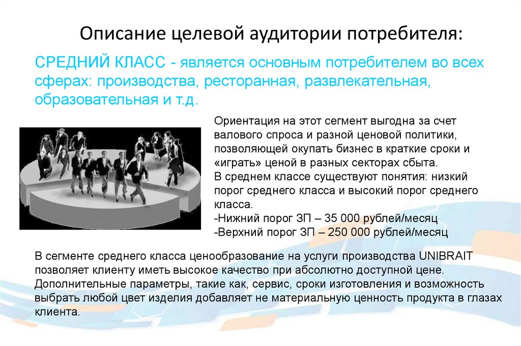 Описание целевой аудитории потребителя:СРЕДНИЙ КЛАСС - является основным потребителем во всех