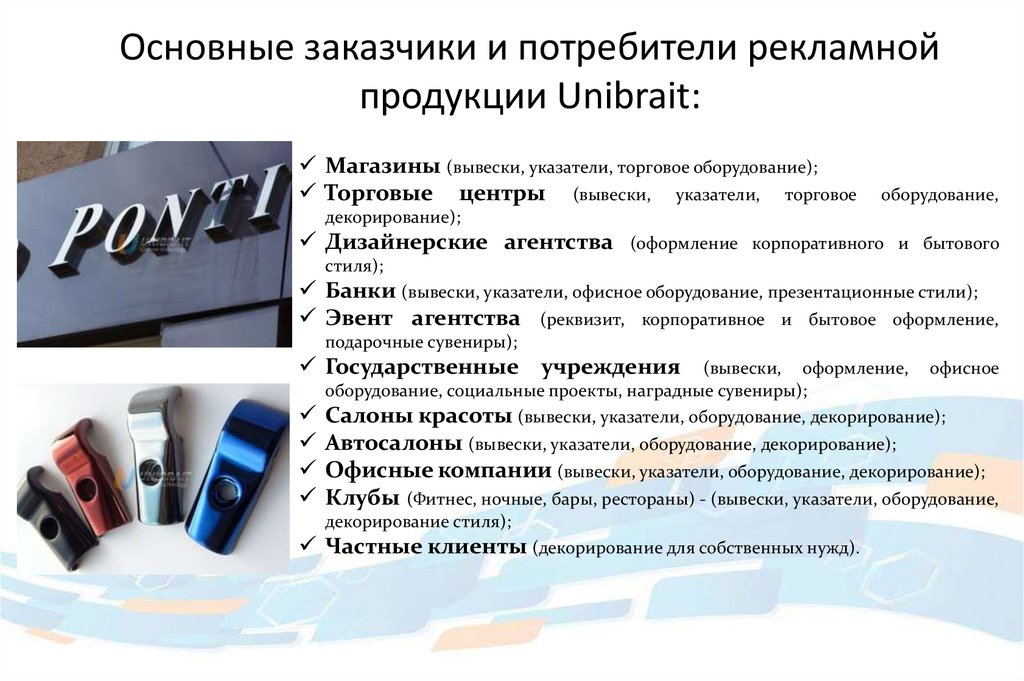 Основные заказчики и потребители рекламнойпродукции Unibrait: