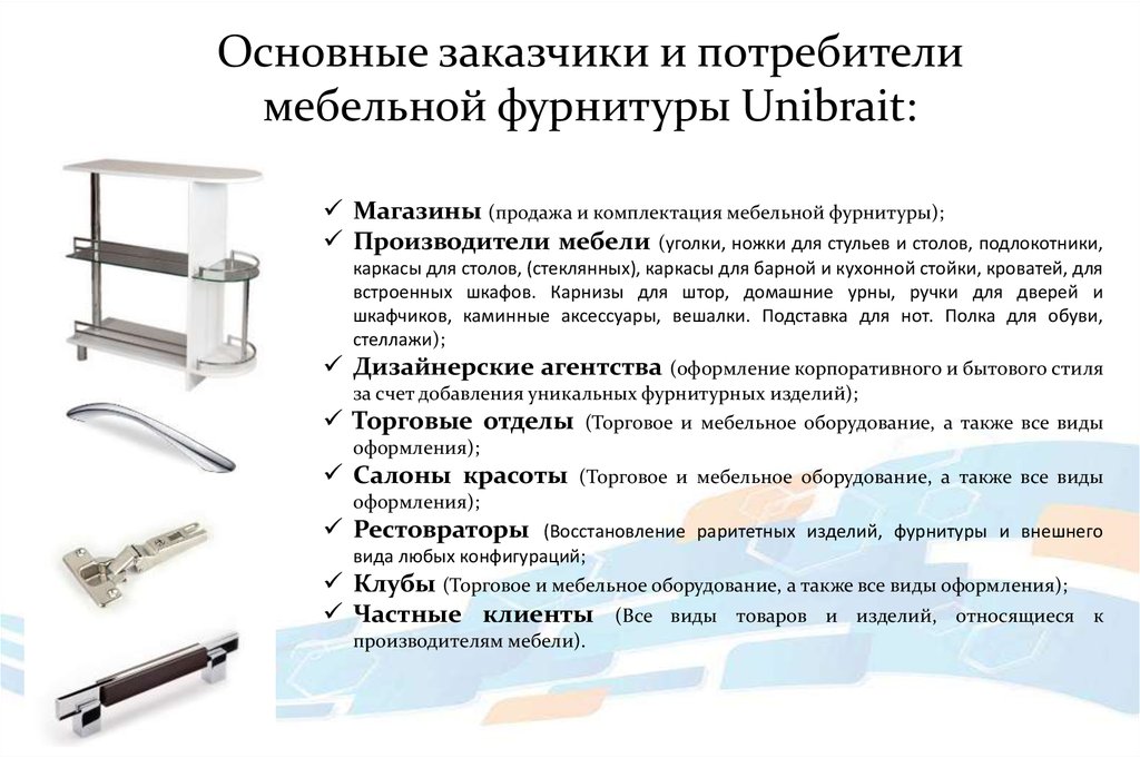 Основные заказчики и потребителимебельной фурнитуры Unibrait: