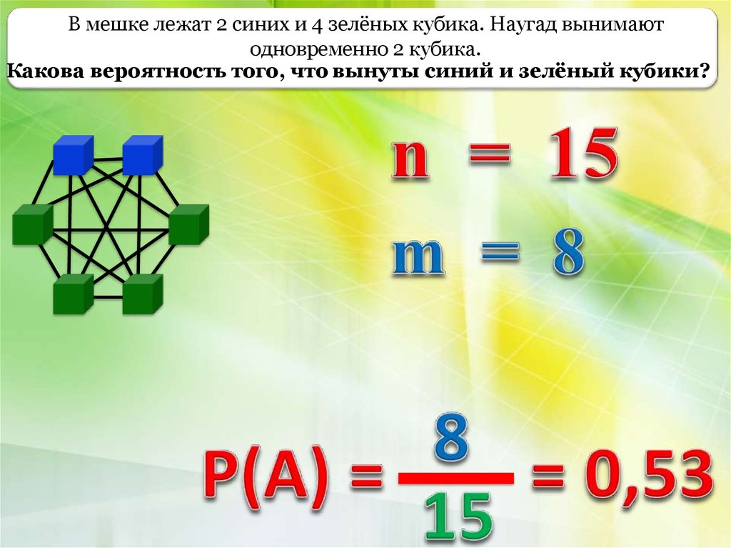 Какова вероятность того, что вынуты синий и зелёный кубики?