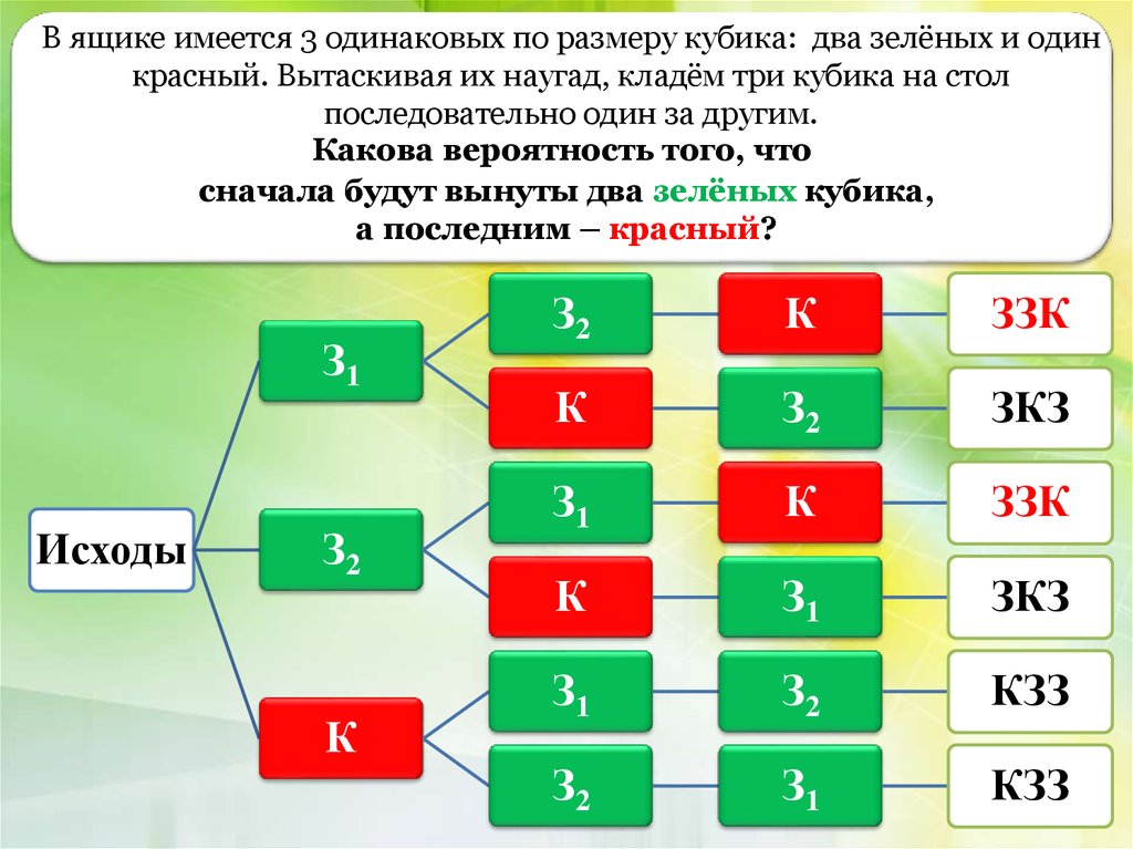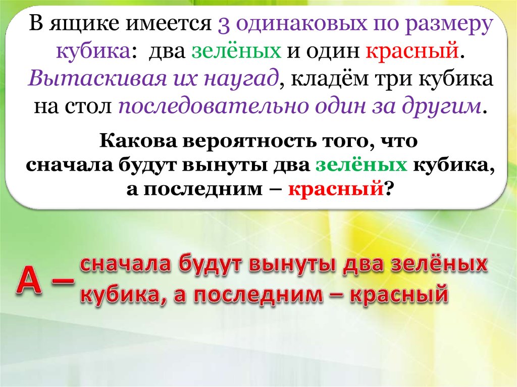 В ящике имеется 3 одинаковых по размеру кубика: два зелёных и одинкрасный. Вытаскивая их наугад, кладём три кубика на стол