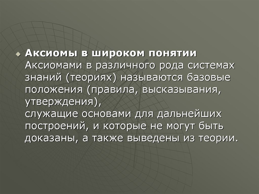 Аксиомы в широком понятииАксиомами в различного рода системах