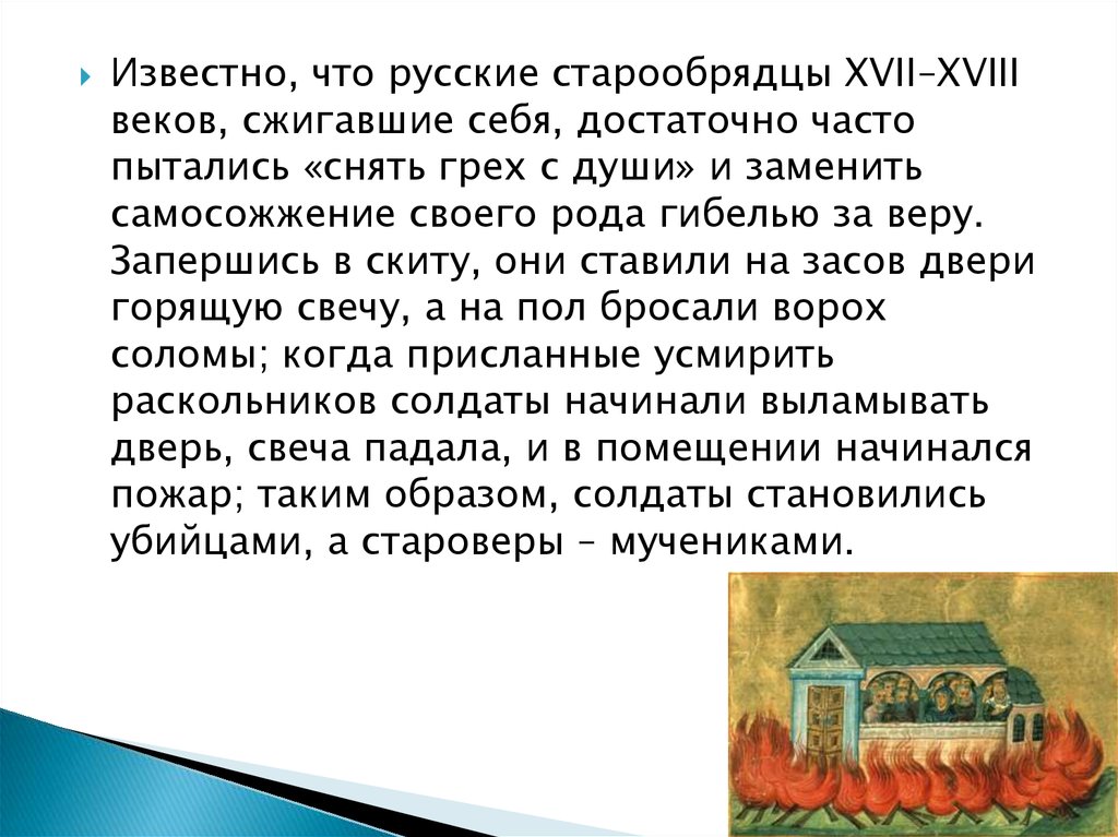 Известно, что русские старообрядцы XVII–XVIIIвеков, сжигавшие себя, достаточно часто