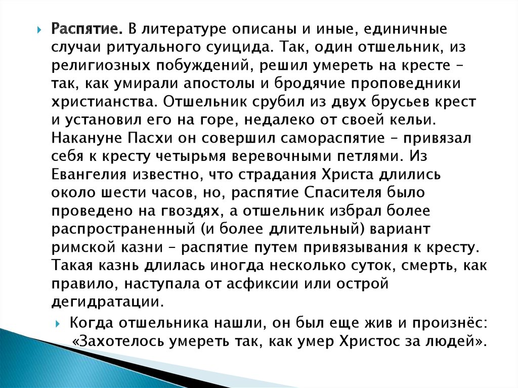 Распятие. В литературе описаны и иные, единичныеслучаи ритуального суицида. Так, один отшельник, из