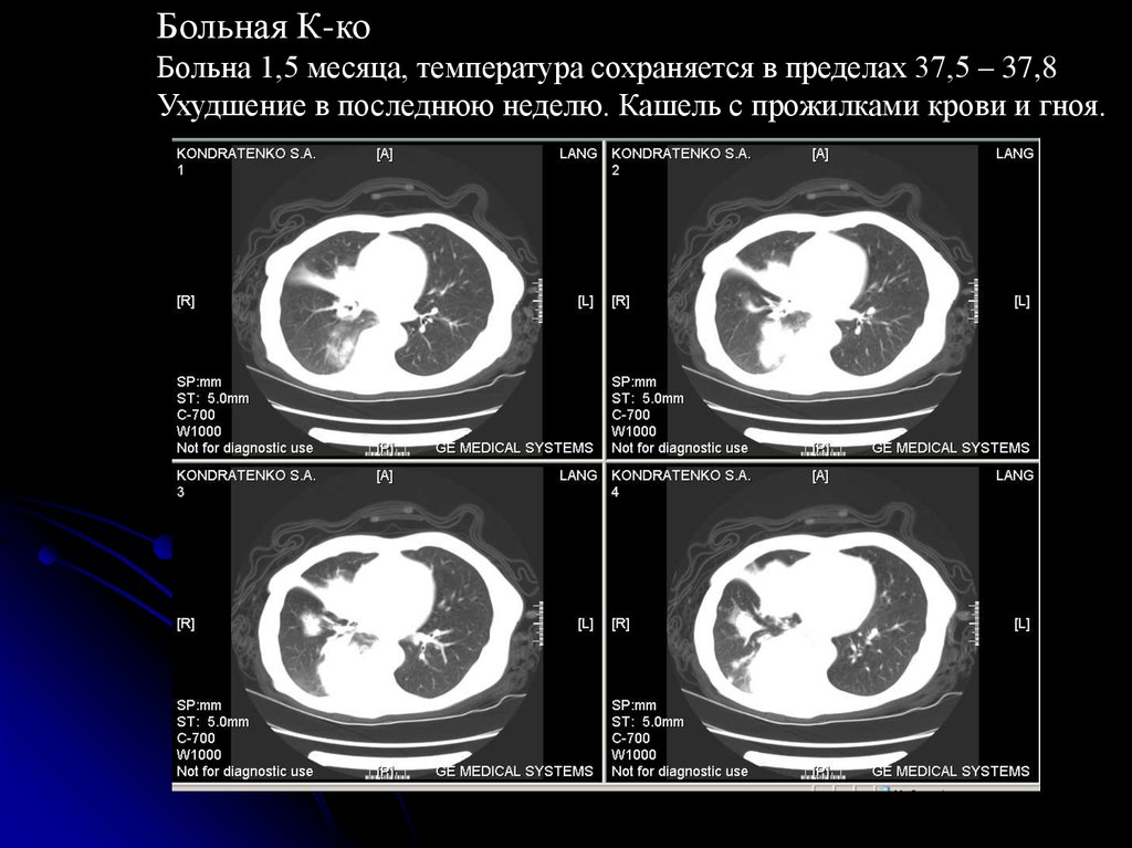 Ухудшение в последнюю неделю. Кашель с прожилками крови и гноя.