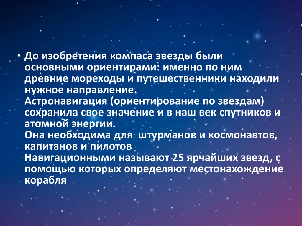• До изобретения компаса звезды былиосновными ориентирами: именно по ним