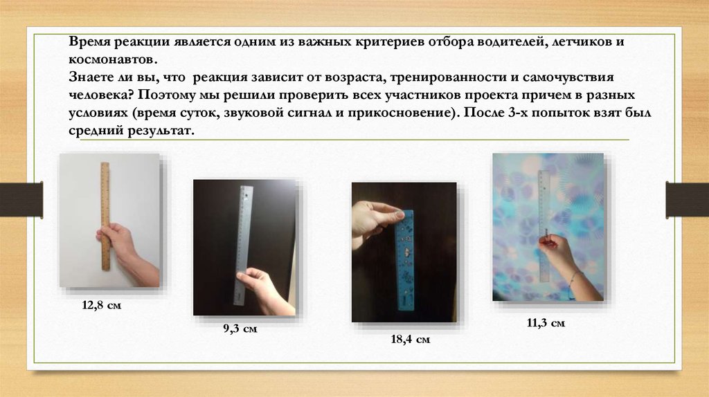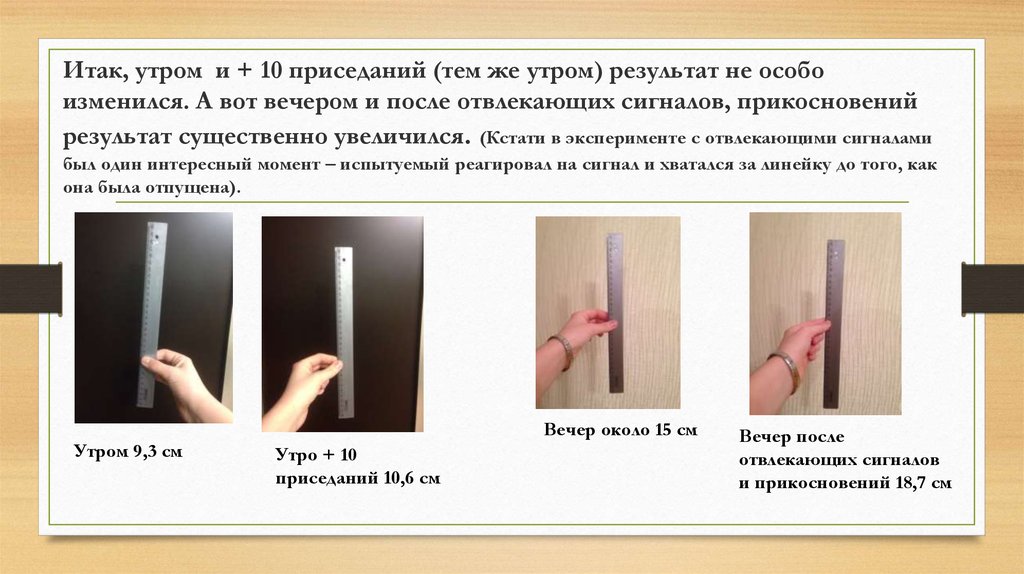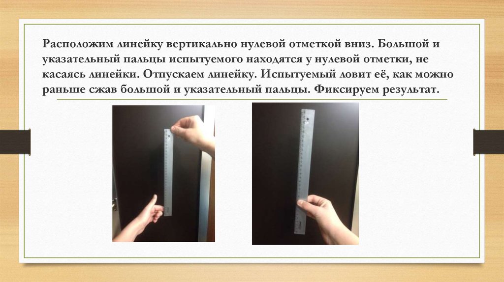 касаясь линейки. Отпускаем линейку. Испытуемый ловит её, как можно
