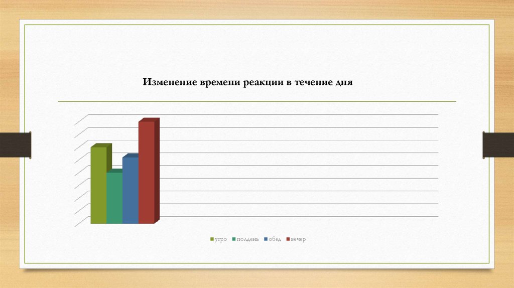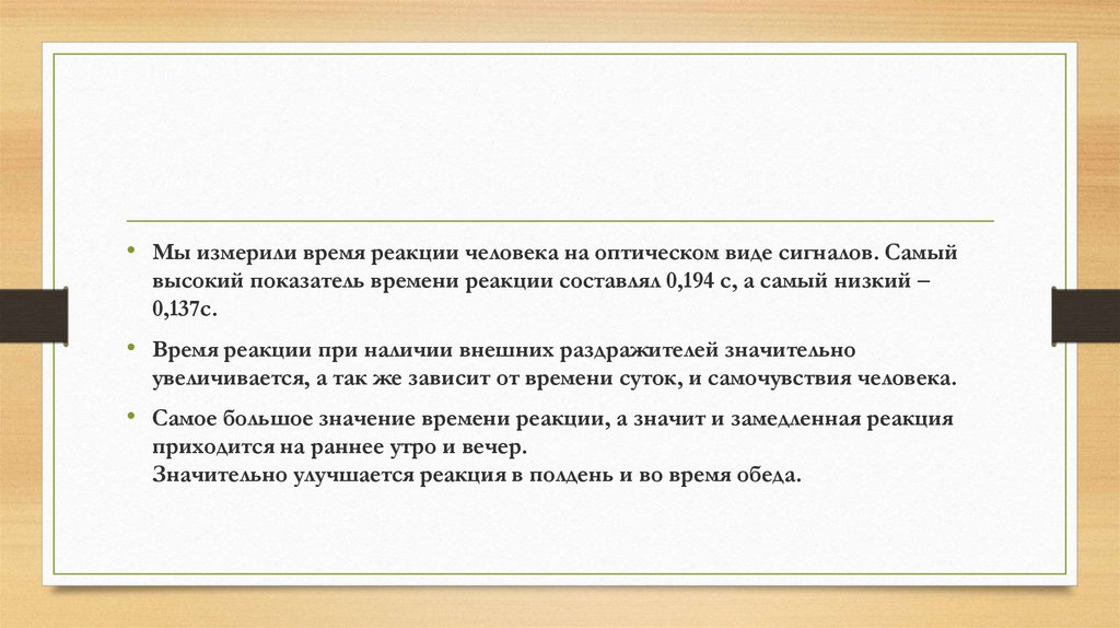• Мы измерили время реакции человека на оптическом виде сигналов. Самыйвысокий показатель времени реакции составлял 0,194 с, а самый низкий –