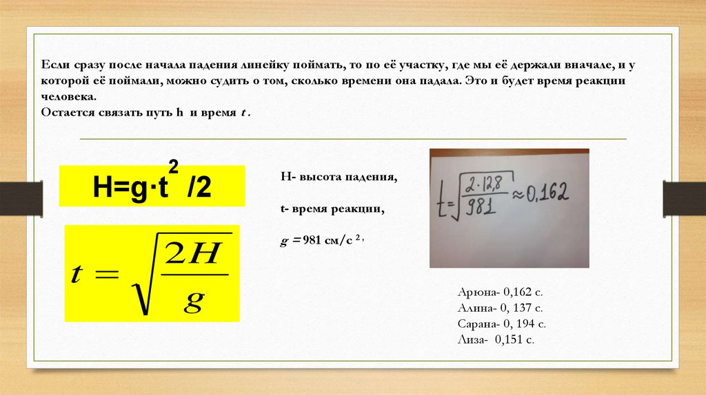 Если сразу после начала падения линейку поймать, то по её участку, где мы её держали вначале, и укоторой её поймали, можно судить о том, сколько времени она падала. Это и будет время реакции