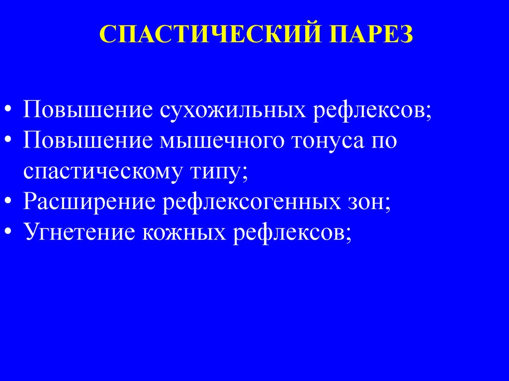СПАСТИЧЕСКИЙ ПАРЕЗ• Повышение сухожильных рефлексов;