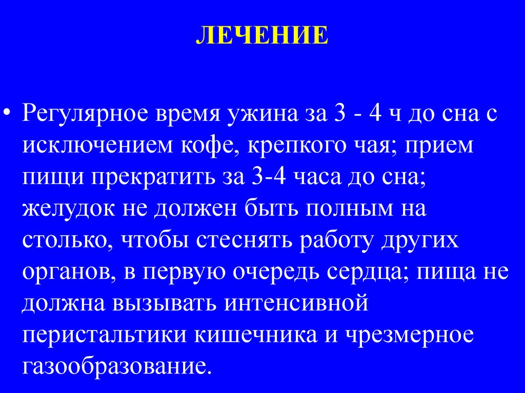 ЛЕЧЕНИЕ• Регулярное время ужина за 3 - 4 ч до сна с