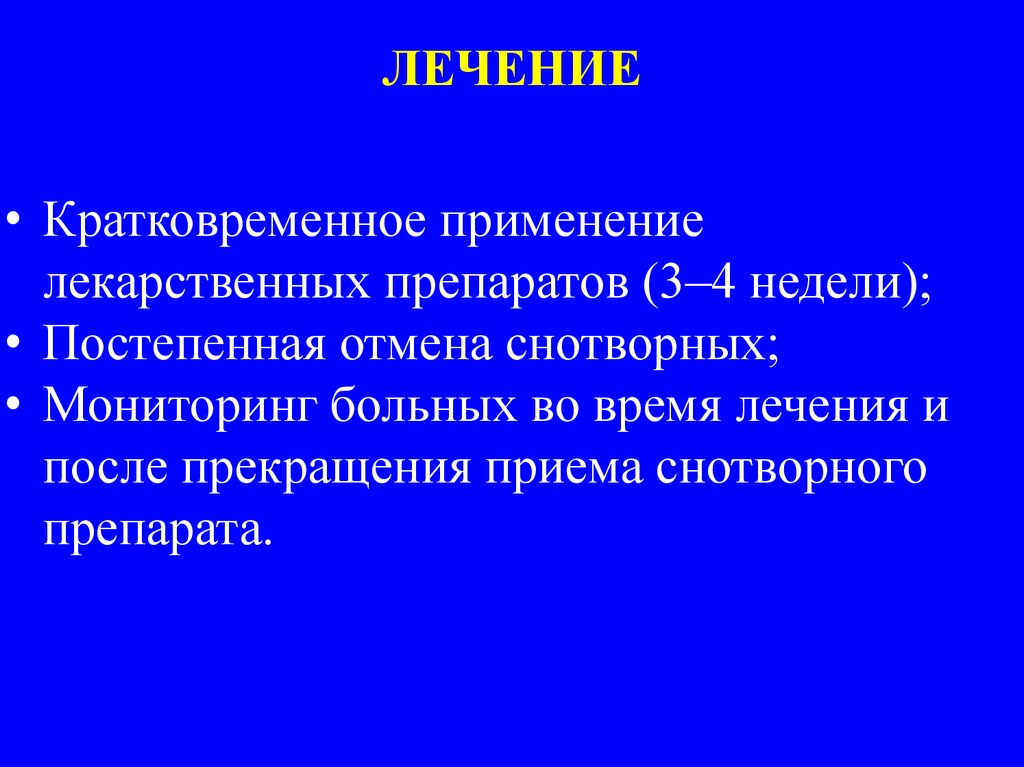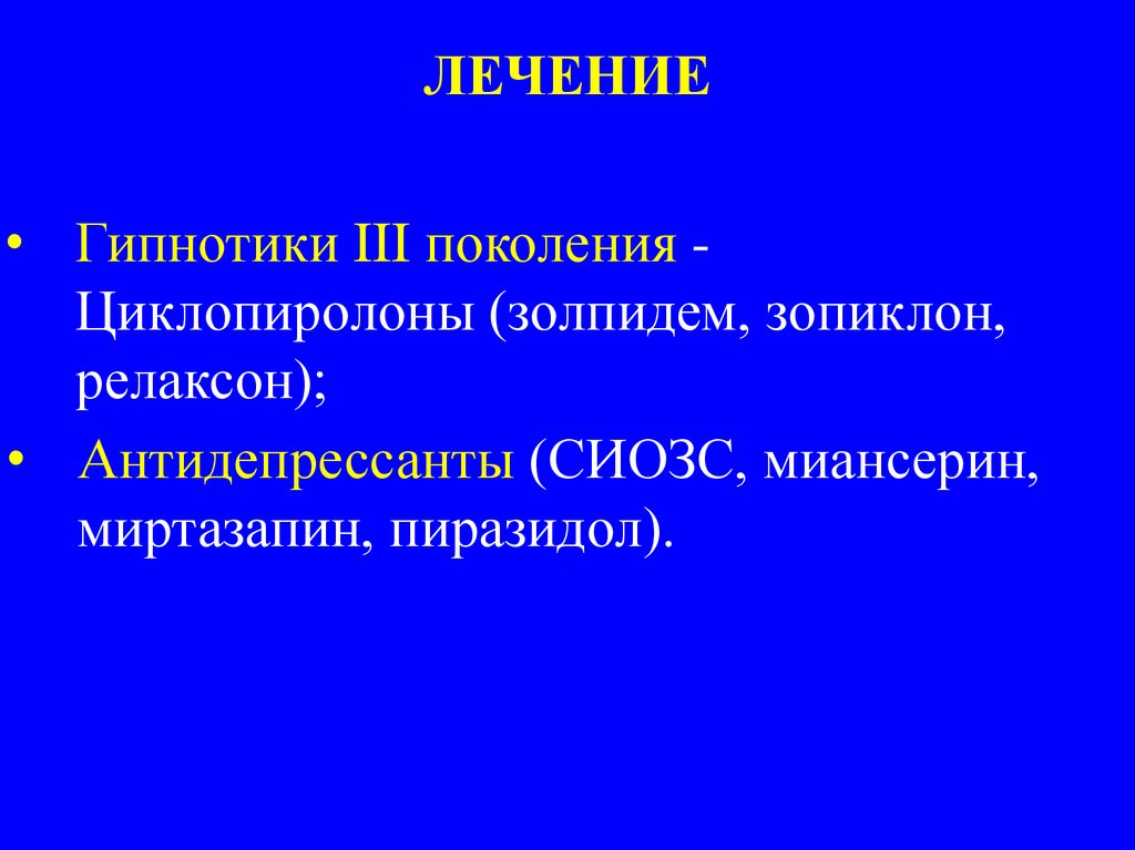 ЛЕЧЕНИЕ• Гипнотики III поколения Циклопиролоны (золпидем, зопиклон,