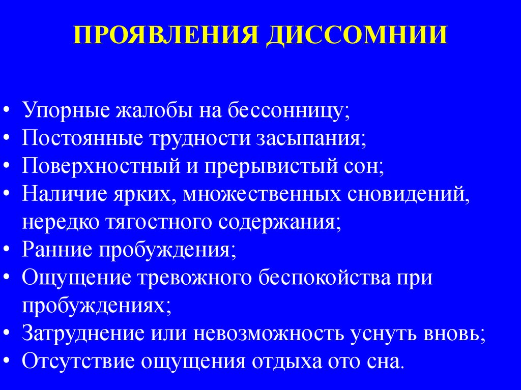 ПРОЯВЛЕНИЯ ДИССОМНИИУпорные жалобы на бессонницу;