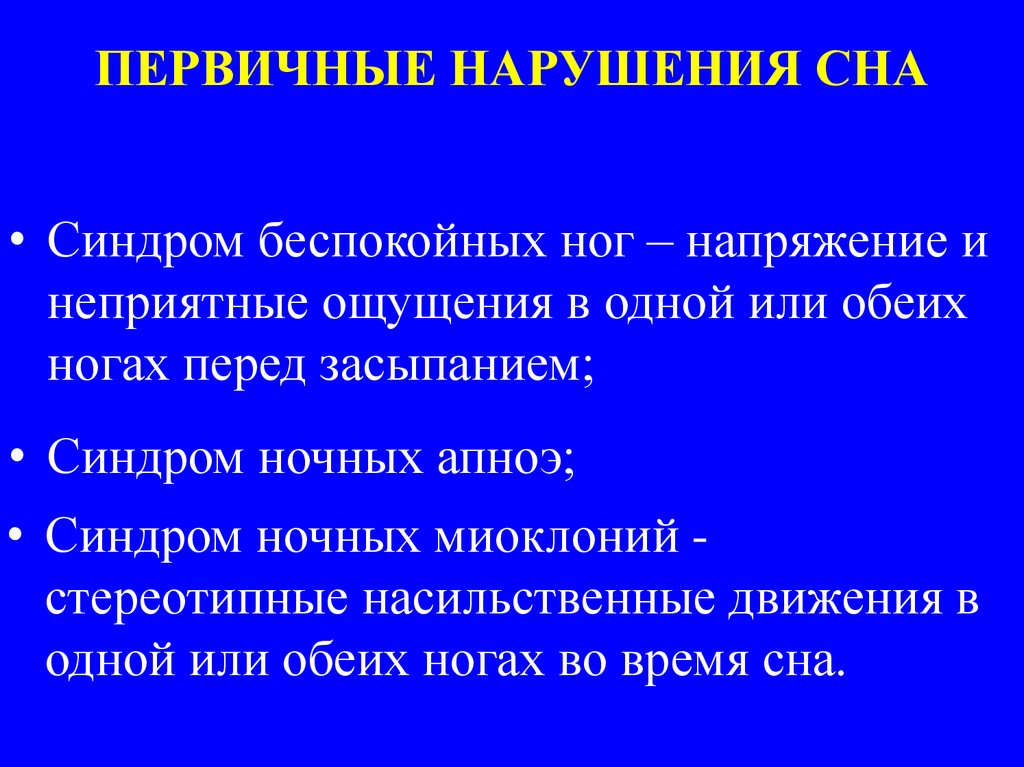 ПЕРВИЧНЫЕ НАРУШЕНИЯ СНА• Синдром беспокойных ног – напряжение и