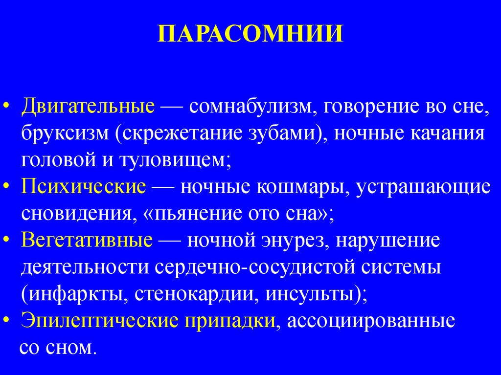 ПАРАСОМНИИ• Двигательные — сомнабулизм, говорение во сне,