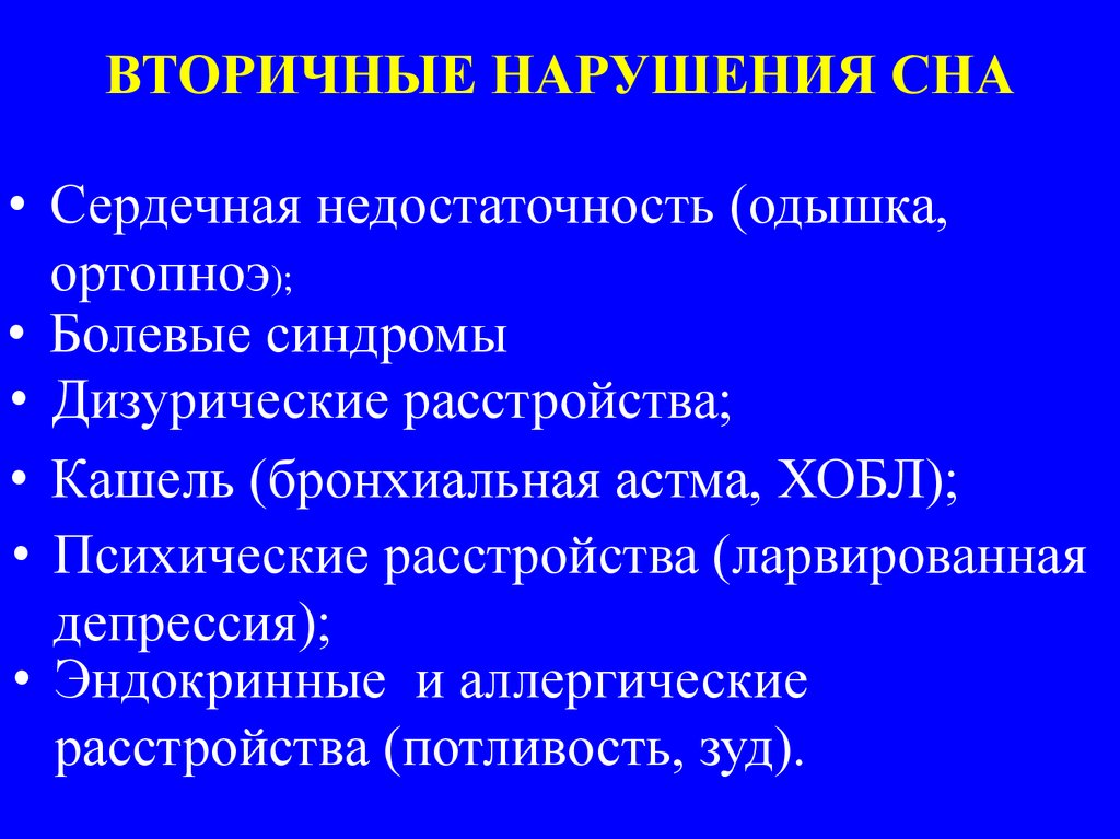 ВТОРИЧНЫЕ НАРУШЕНИЯ СНА• Сердечная недостаточность (одышка,
