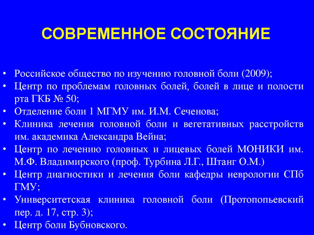 СОВРЕМЕННОЕ СОСТОЯНИЕ• Российское общество по изучению головной боли (2009);