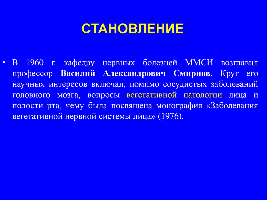 СТАНОВЛЕНИЕ• В 1960 г. кафедру нервных болезней ММСИ возглавил