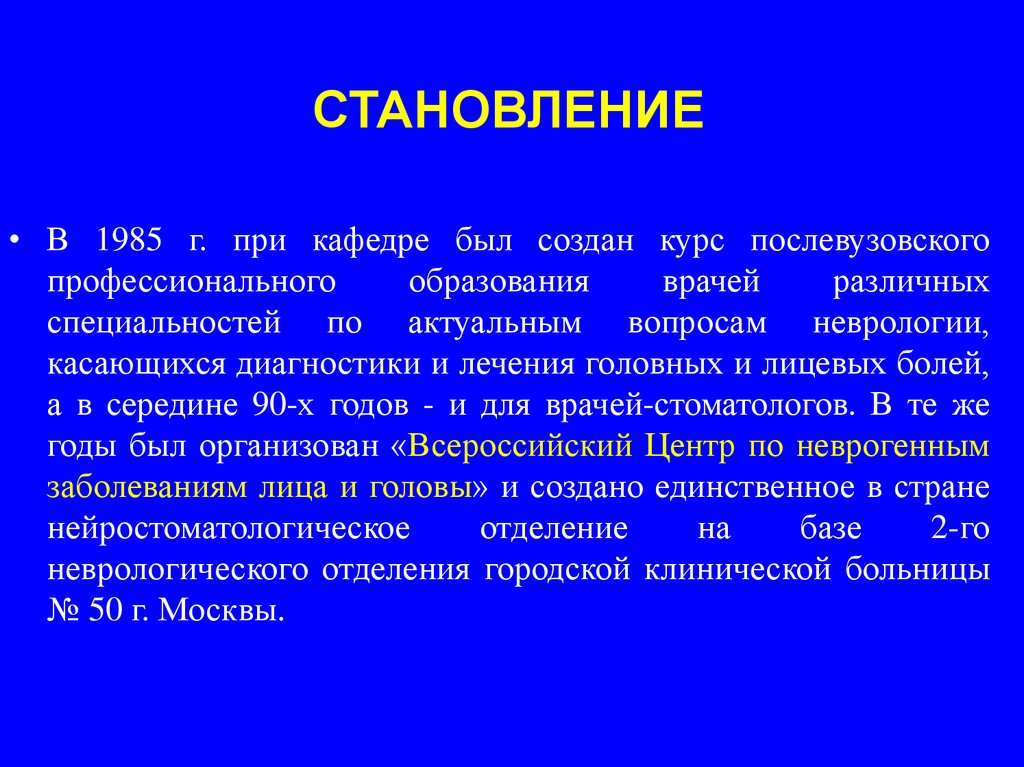СТАНОВЛЕНИЕ• В 1985 г. при кафедре был создан курс послевузовского