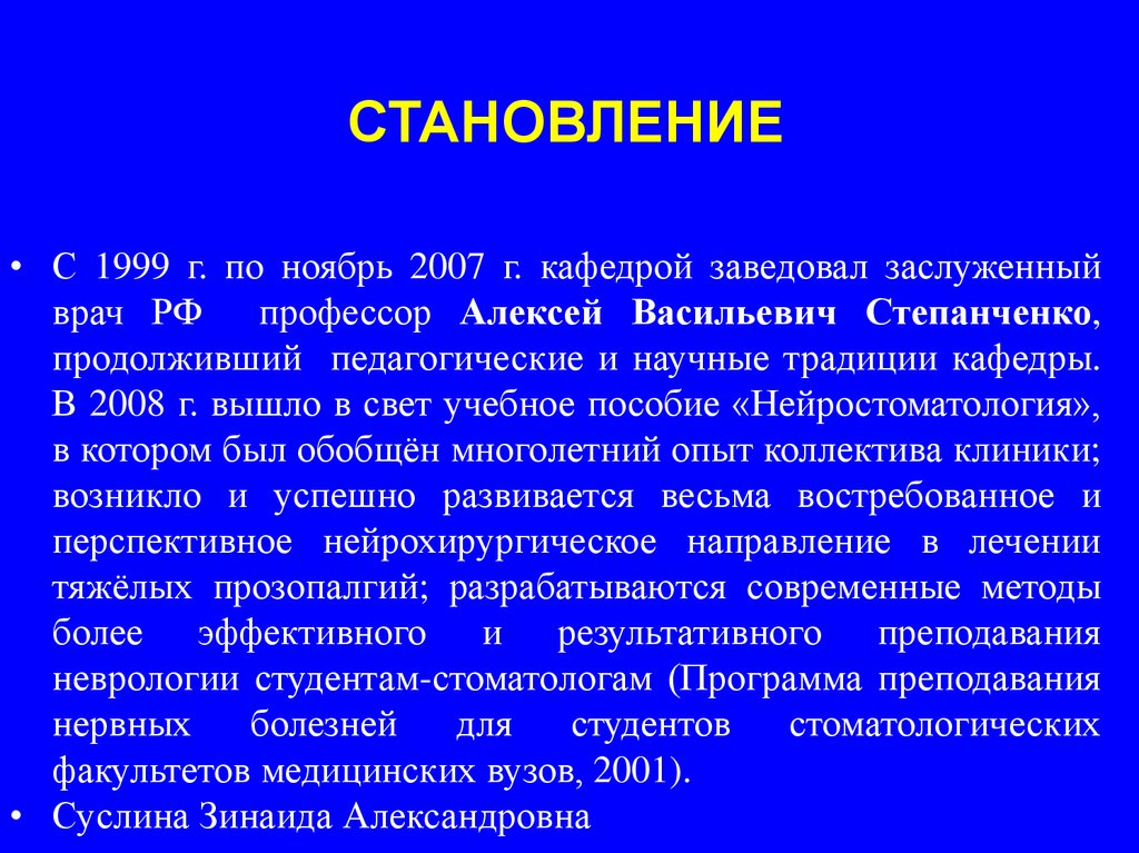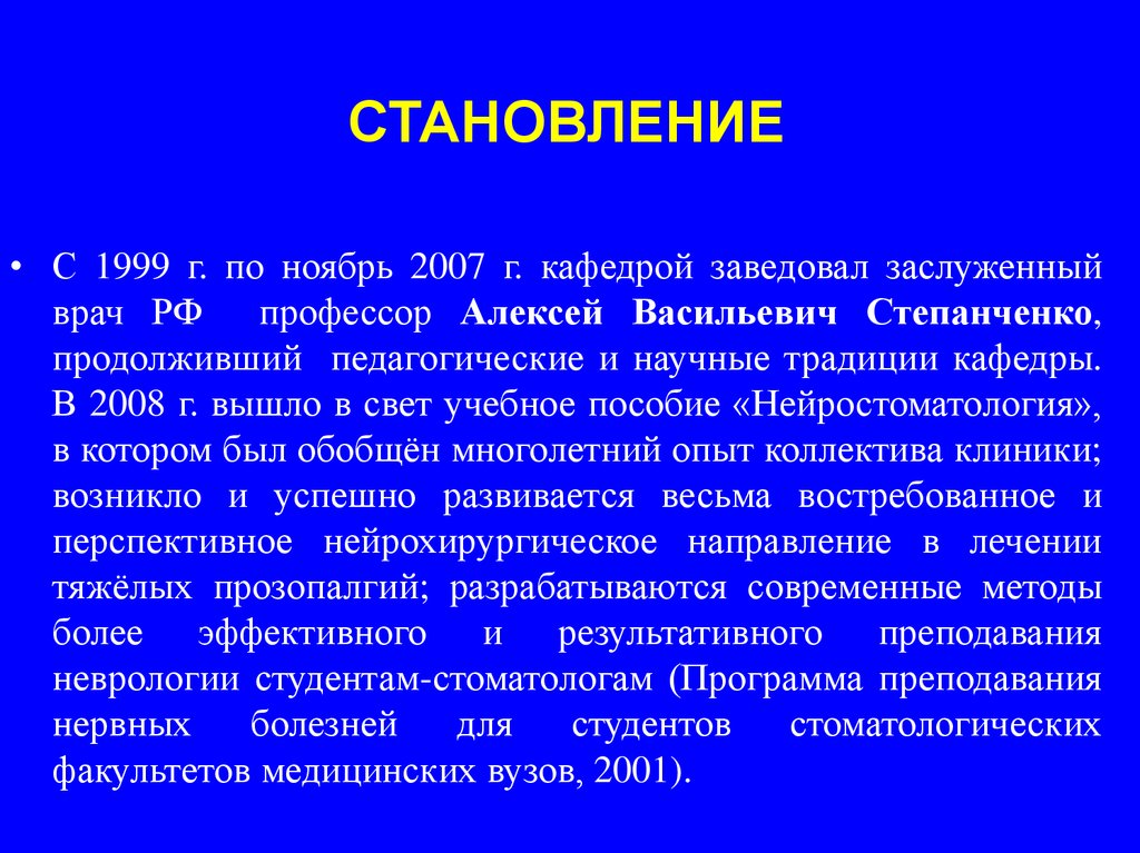 СТАНОВЛЕНИЕ• С 1999 г. по ноябрь 2007 г. кафедрой заведовал заслуженный