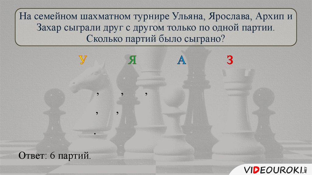 На семейном шахматном турнире Ульяна, Ярослава, Архип иЗахар сыграли друг с другом только по одной партии.