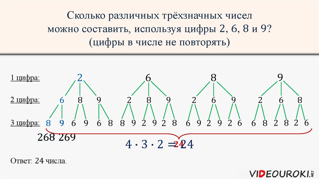 Сколько различных трёхзначных чиселможно составить, используя цифры 2, 6, 8 и 9?