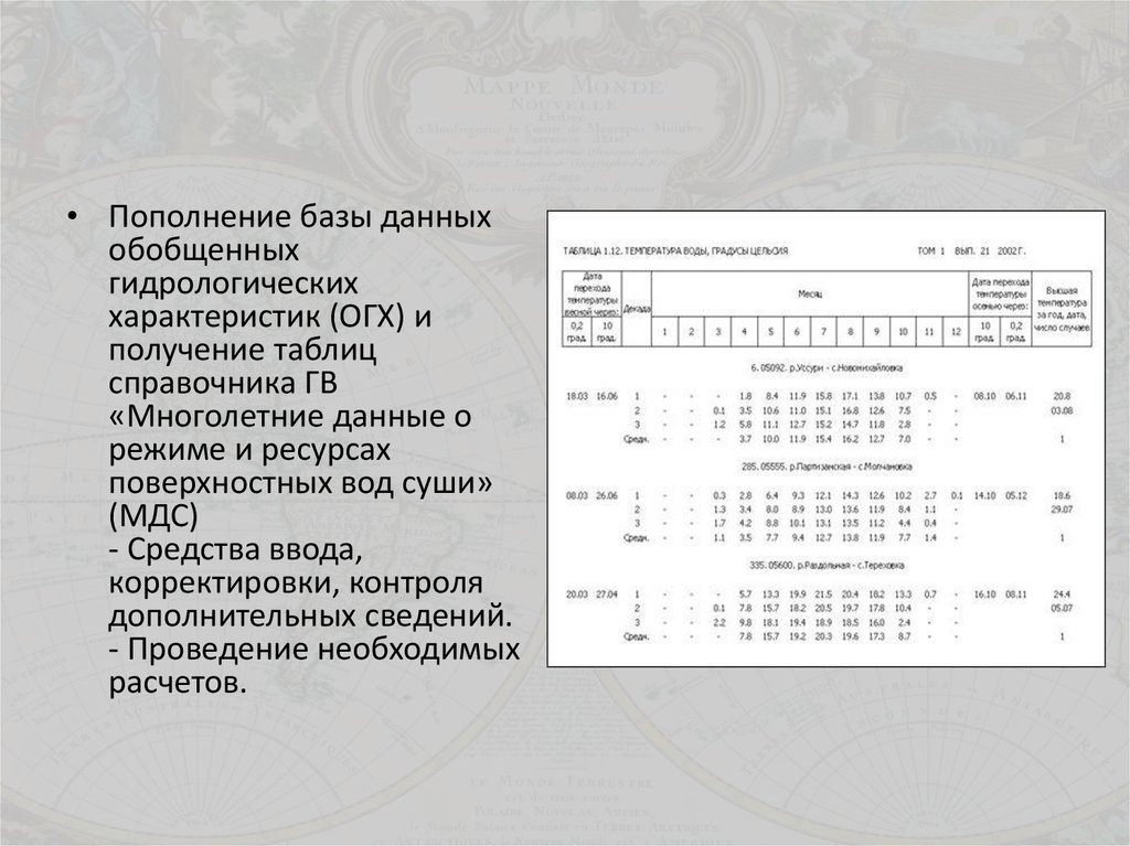 • занесение данных гидрологических наблюдений, получаемых нагидрологических постах