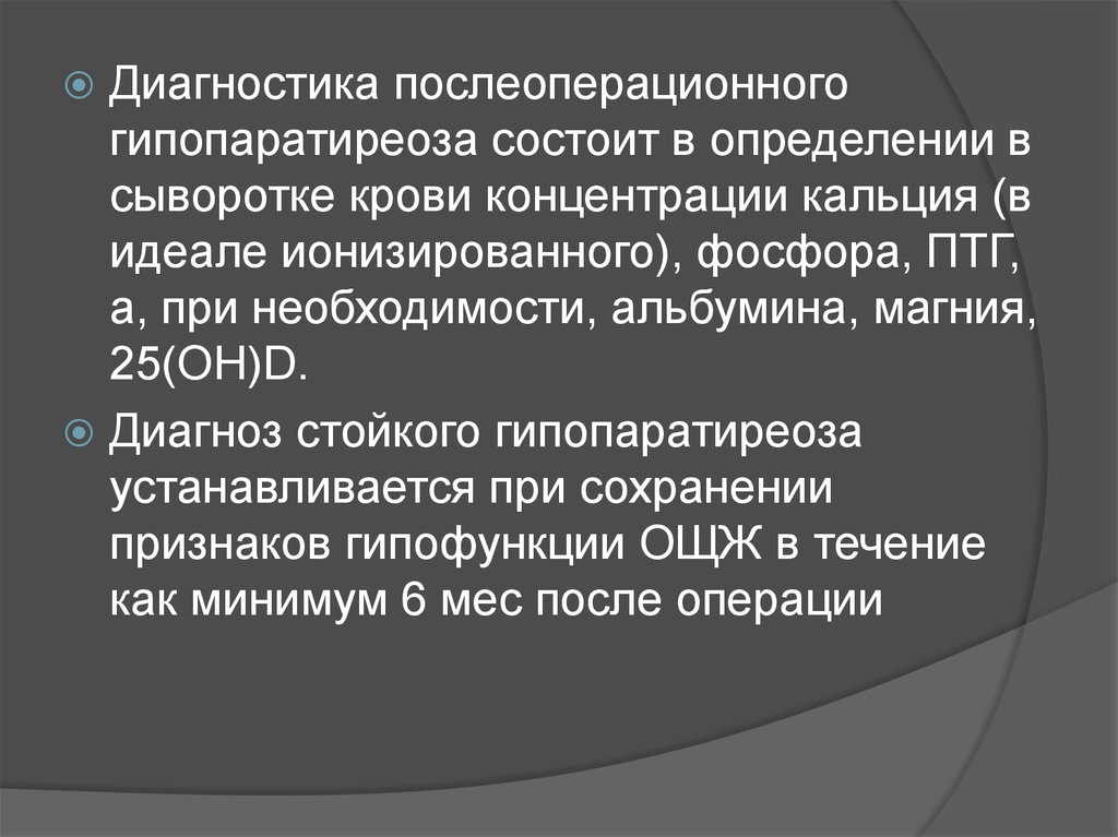 Диагностика послеоперационногогипопаратиреоза состоит в определении в