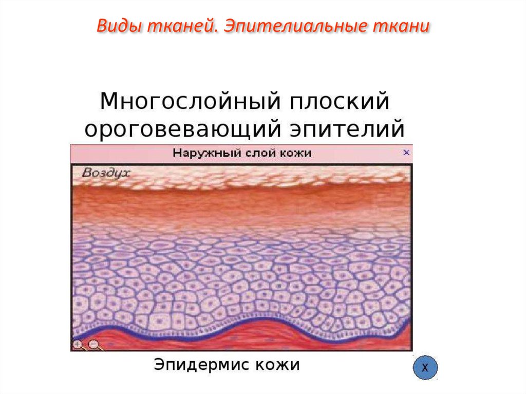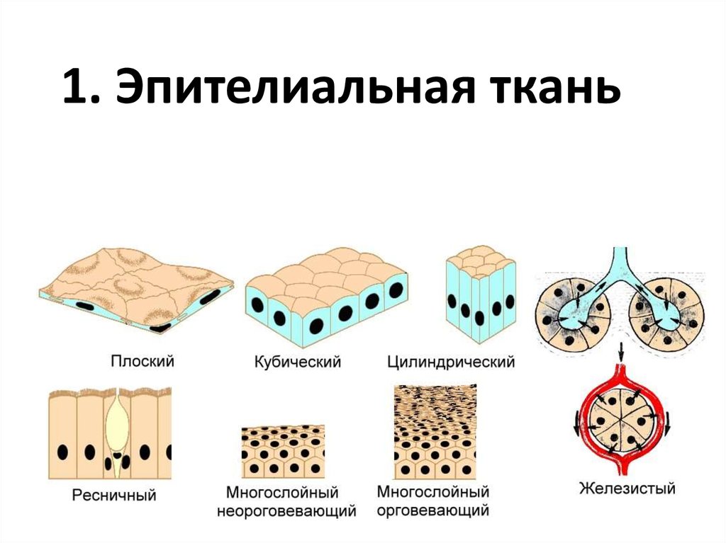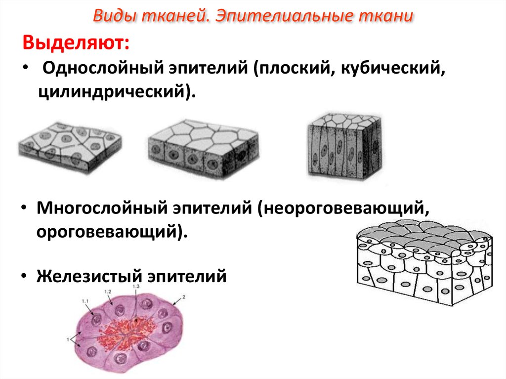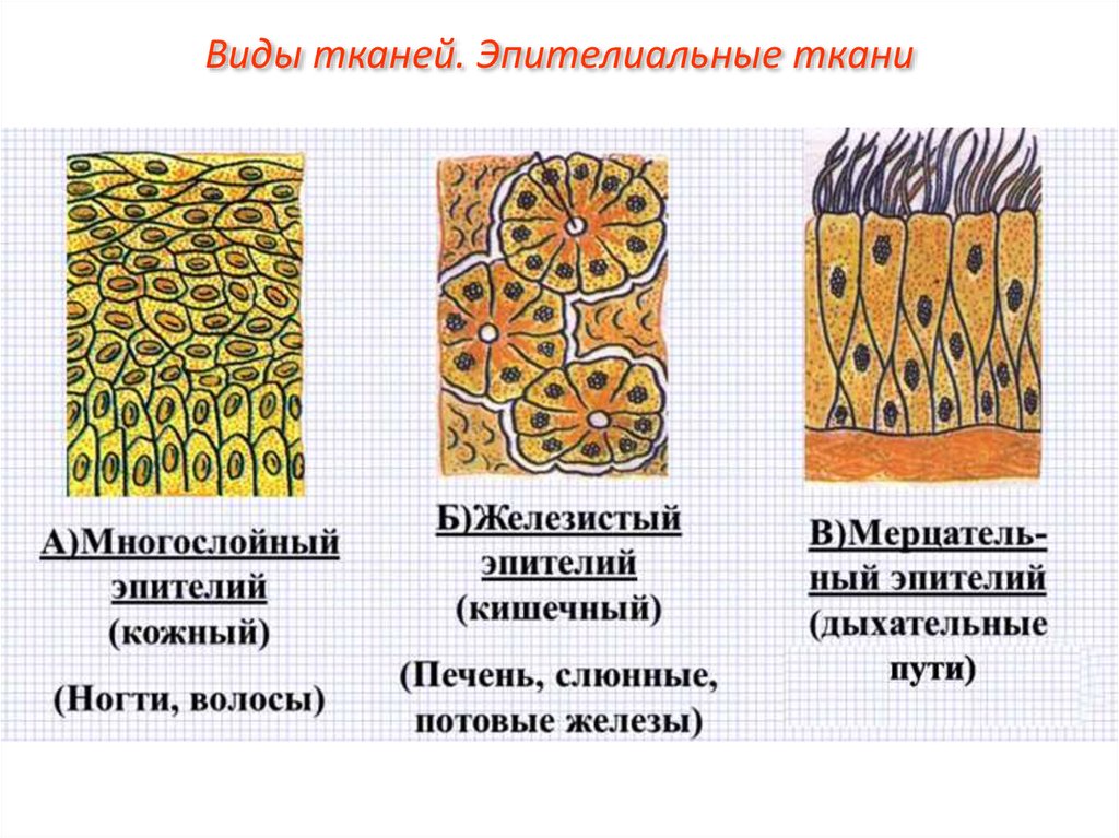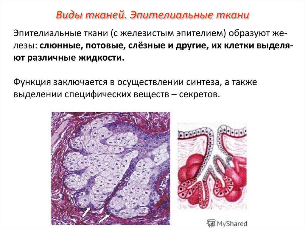 Виды тканей. Эпителиальные тканиЭпителиальные ткани (с железистым эпителием) образуют железы: слюнные, потовые, слёзные и другие, их клетки выделяют различные жидкости.