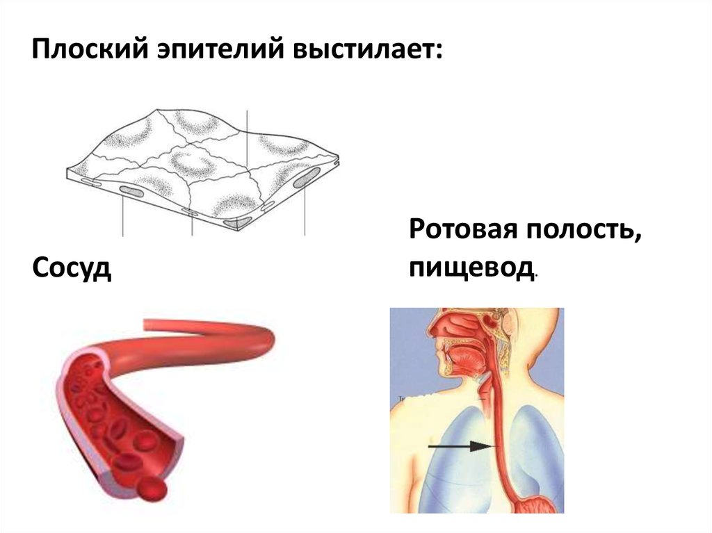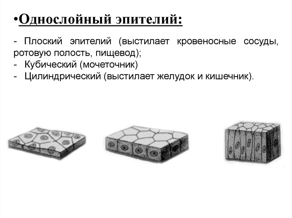 •Однослойный эпителий:- Плоский эпителий (выстилает кровеносные сосуды,