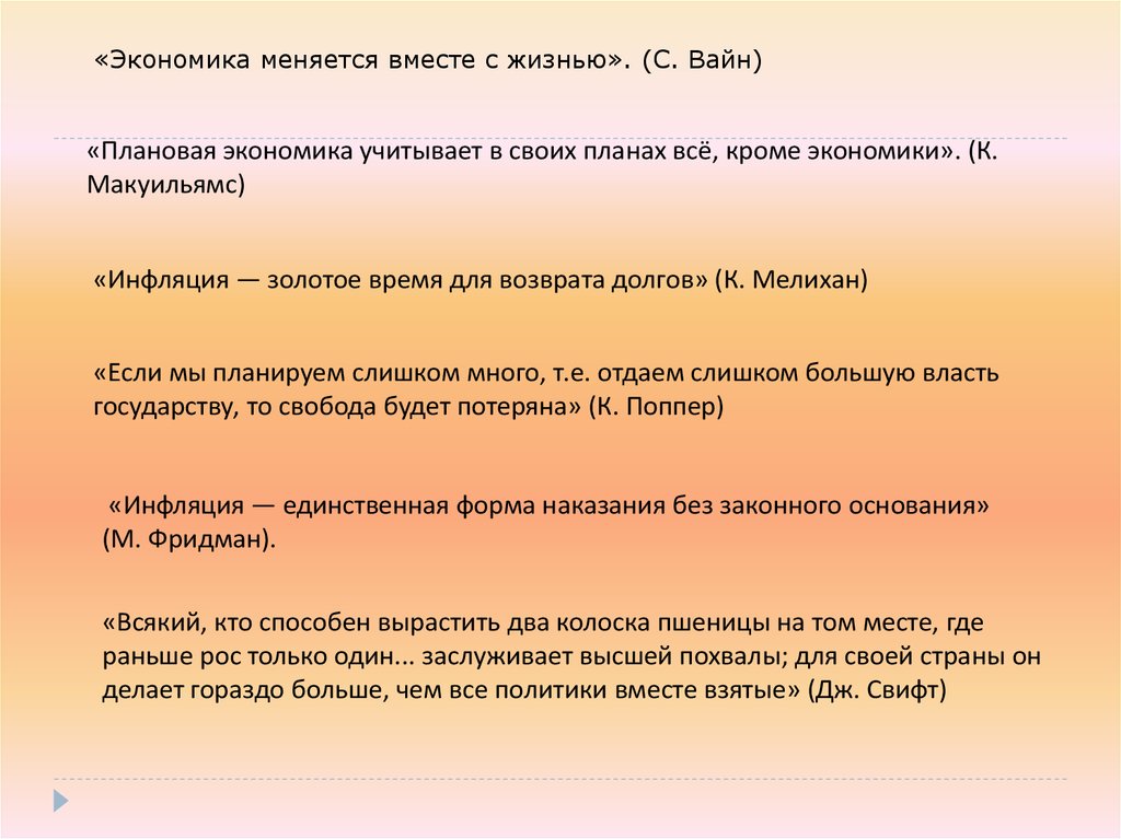 «Экономика меняется вместе с жизнью». (С. Вайн)«Плановая экономика учитывает в своих планах всё, кроме экономики». (К.