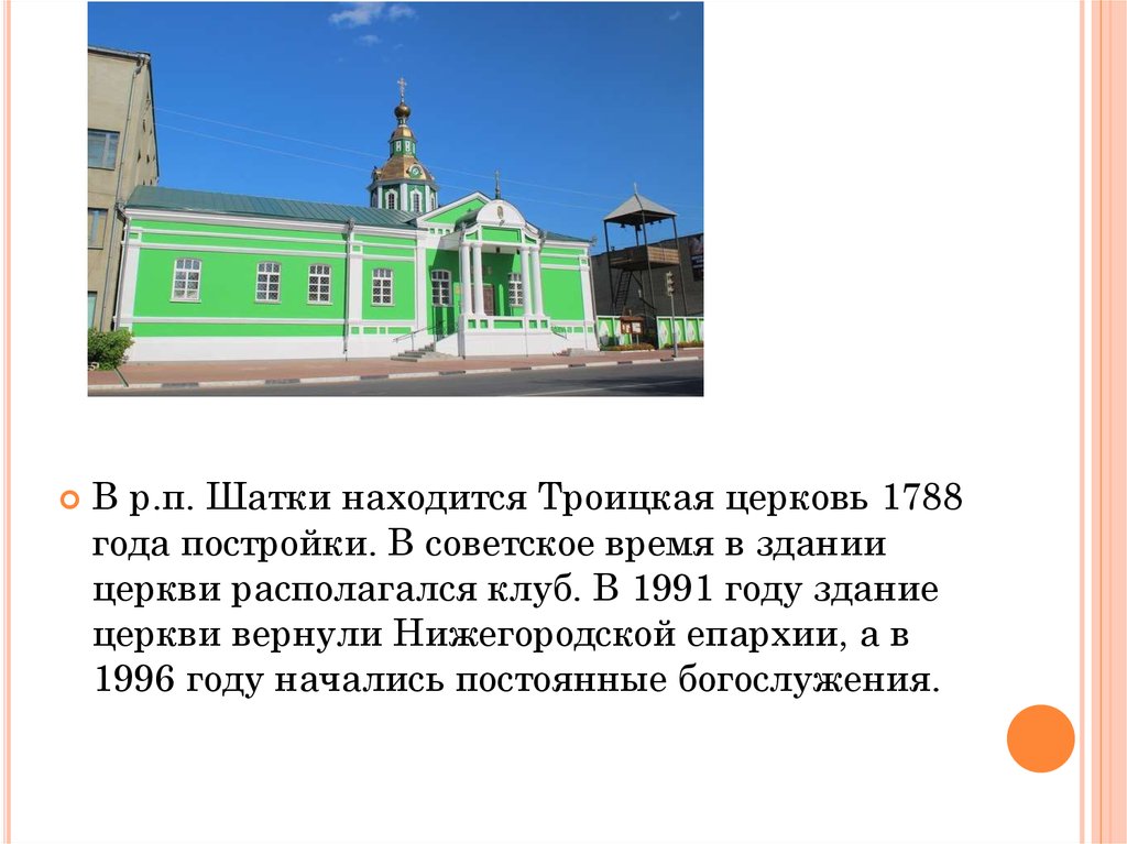 В р.п. Шатки находится Троицкая церковь 1788года постройки. В советское время в здании