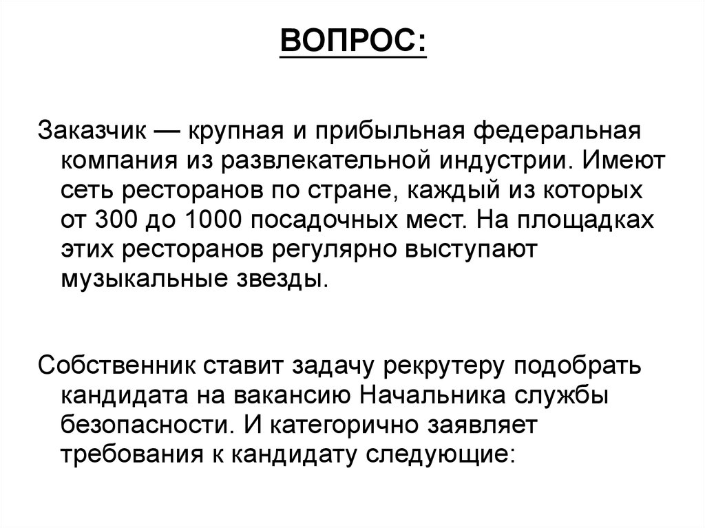 Мини-тест. Подбор кандидата на вакансию Начальника службы безопасности