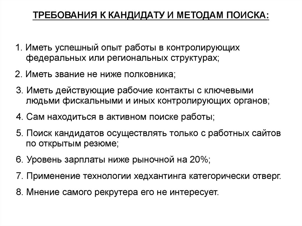 ТРЕБОВАНИЯ К КАНДИДАТУ И МЕТОДАМ ПОИСКА:1. Иметь успешный опыт работы в контролирующих