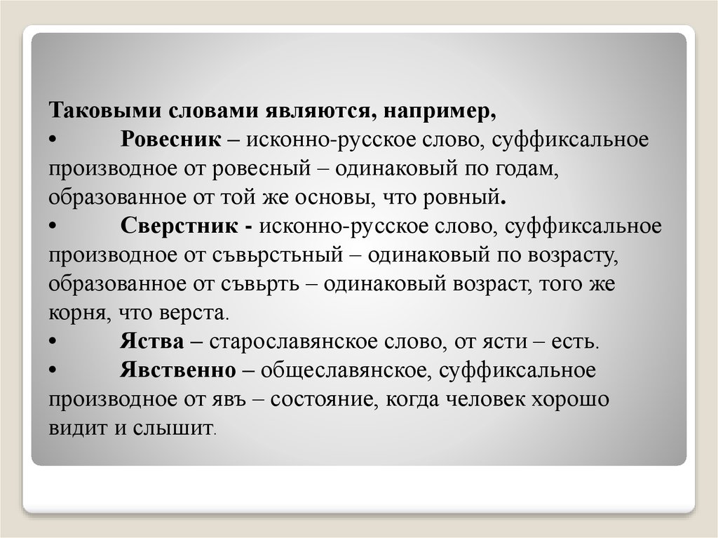 Таковыми словами являются, например,Ровесник – исконно-русское слово, суффиксальное