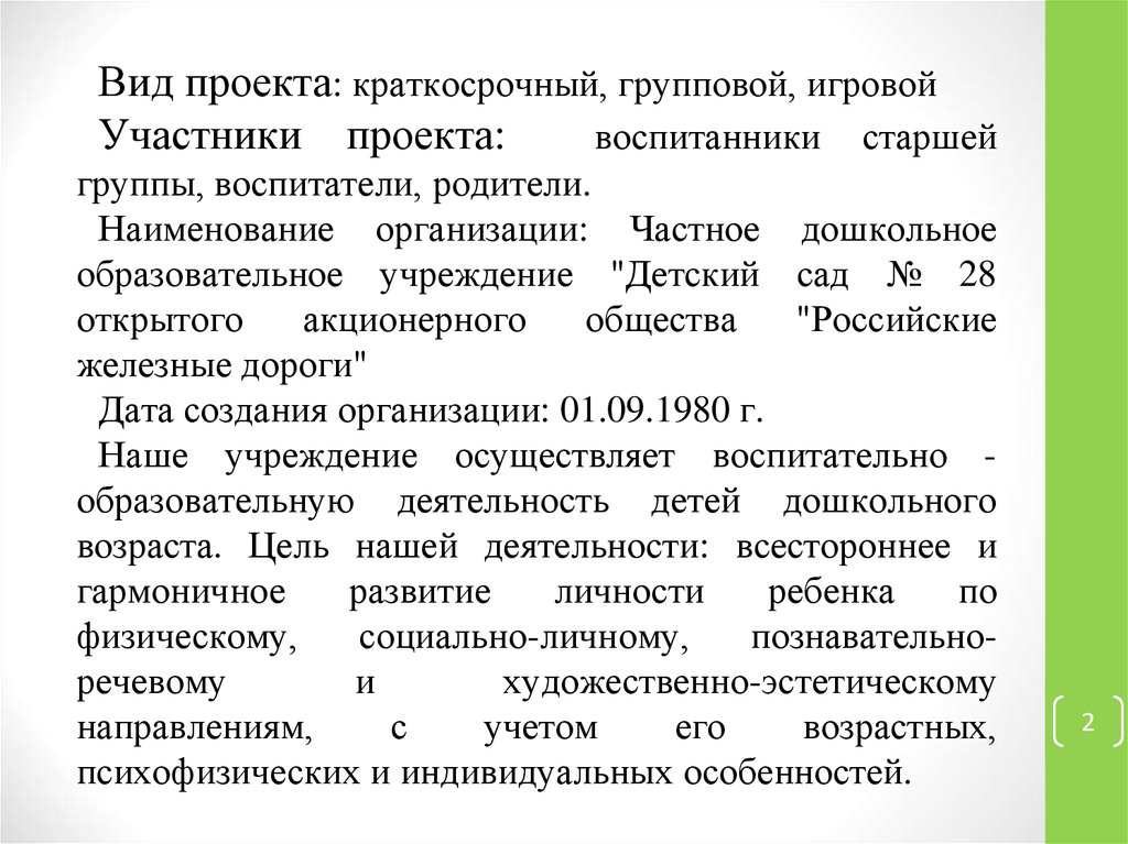 Вид проекта: краткосрочный, групповой, игровойУчастники проекта: