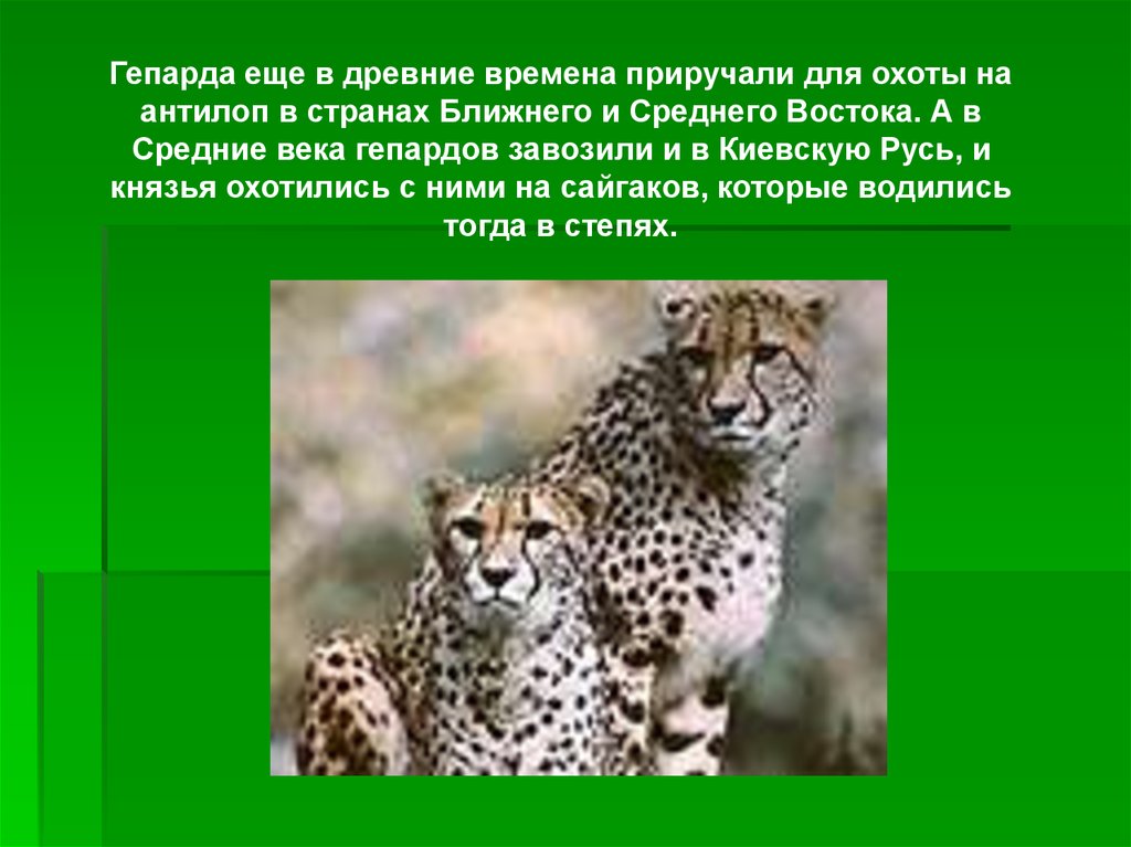 Гепарда еще в древние времена приручали для охоты наантилоп в странах Ближнего и Среднего Востока. А в