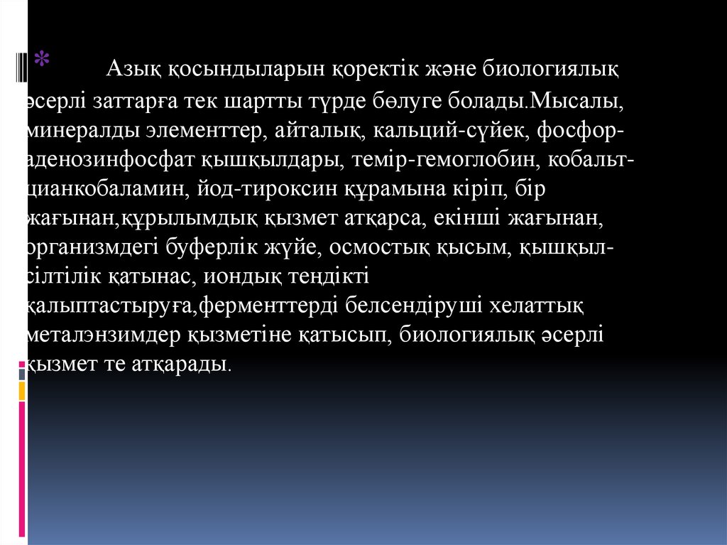 минералды элементтер, айталық, кальций-сүйек, фосфораденозинфосфат қышқылдары, темір-гемоглобин, кобальтцианкобаламин, йод-тироксин құрамына кіріп, бір