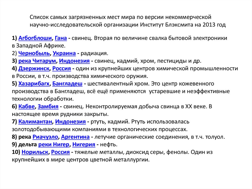 Список самых загрязненных мест мира по версии некоммерческойнаучно-исследовательской организации Институт Блэксмита на 2013 год