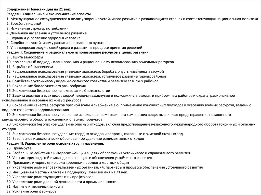 Содержание Повестки дня на 21 век:Раздел I. Социальные и экономические аспекты