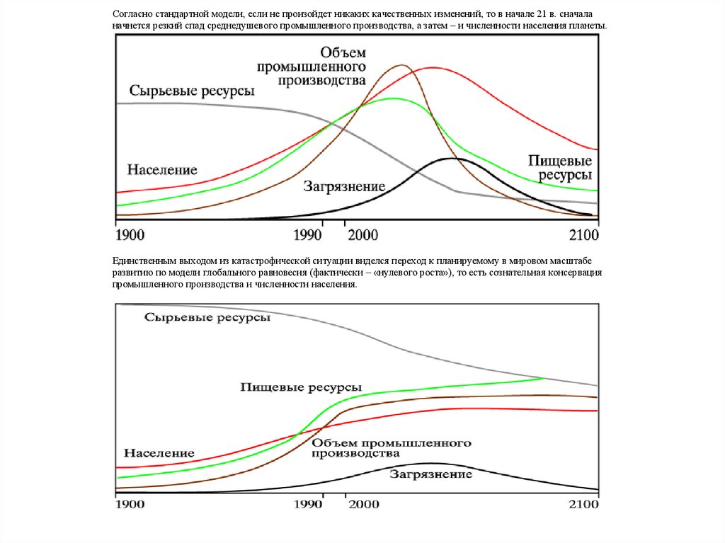 Согласно стандартной модели, если не произойдет никаких качественных изменений, то в начале 21 в. сначаланачнется резкий спад среднедушевого промышленного производства, а затем – и численности населения планеты.