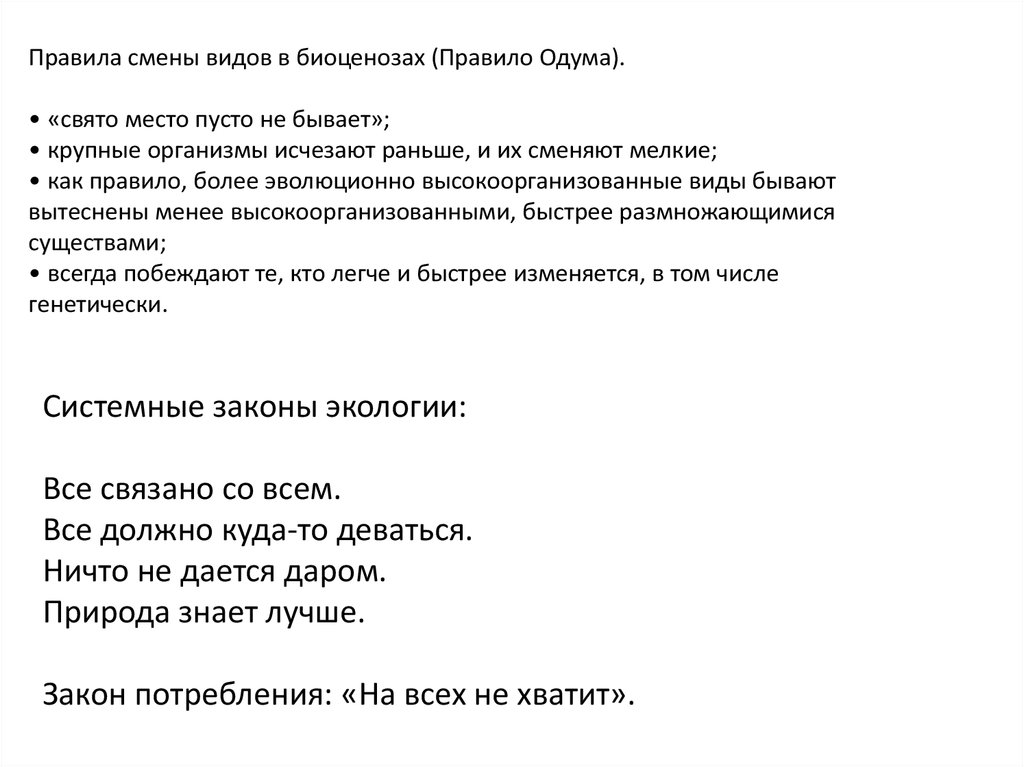 Правила смены видов в биоценозах (Правило Одума).• «свято место пусто не бывает»;