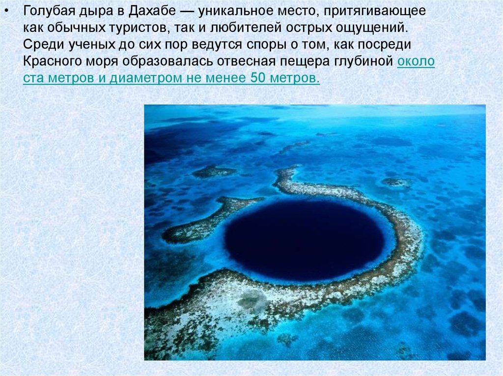 • Голубая дыра в Дахабе — уникальное место, притягивающеекак обычных туристов, так и любителей острых ощущений.