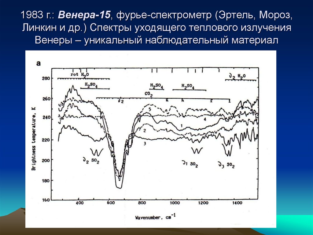 15. 1983 г.: Венера-15, фурье-спектрометр (Эртель, Мороз, Линкин и др.) Спектры уходящего теплового излучения Венеры – уникальный