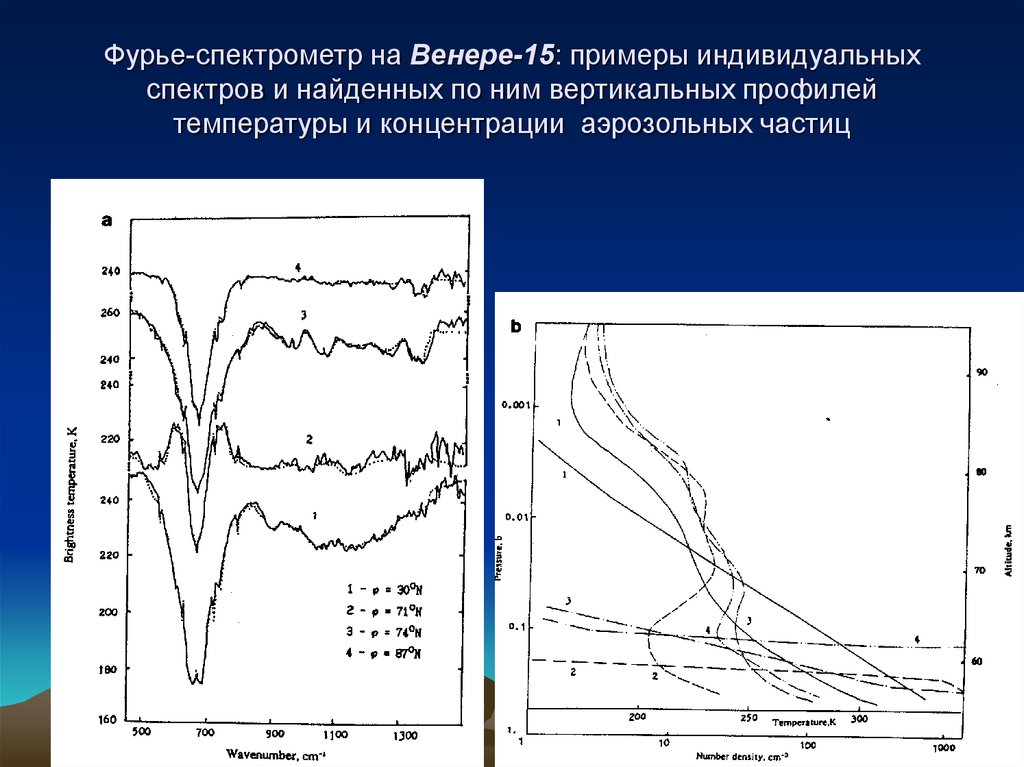 наблюдательный материал16. Фурье-спектрометр на Венере-15: примеры индивидуальных спектров и найденных по ним вертикальных профилей температуры и