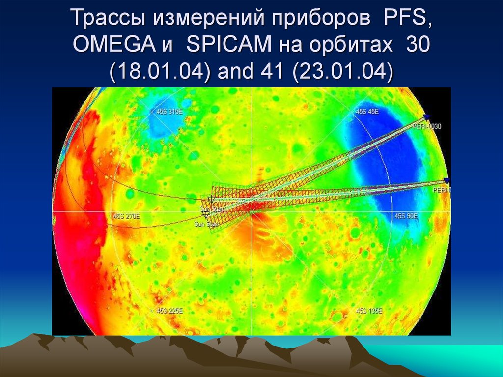 29. Трассы измерений приборов PFS, OMEGA и SPICAM на орбитах 30 (18.01.04) and 41 (23.01.04)